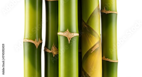Obraz premium A closeup shows five green bamboo stalks against a white backdrop