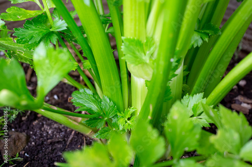 © DAVID, Obraz premium A closeup view of a celery plant growing in soil.