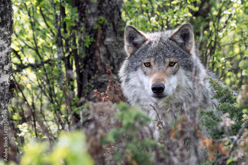© Jon Anders Wiken, Fototapeta premium A closeup wildlife portrait of a grey wolf outdoors in the forest.
