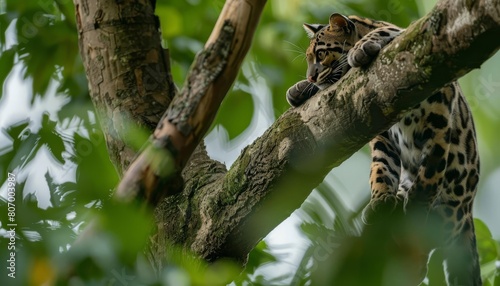 Fototapeta premium A clouded leopard climbing a tree with ease, scanning for its next meal from...