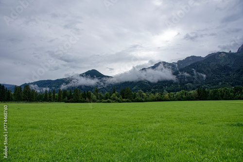 Fototapeta premium A cloudy autumn day near a castle at the foot of the Alps.