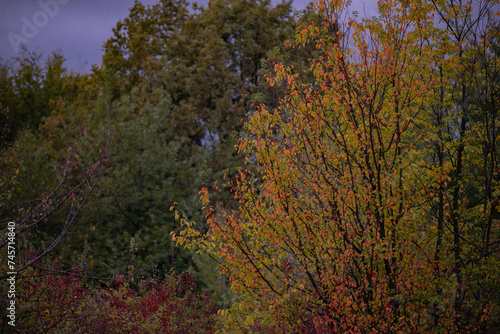 Fototapeta premium a cloudy day in the magical forest during autumn season with fog and colorful...