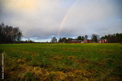 Naklejka premium A cloudy landscape view of open field filled with grass with cottages and rainbow in the sky in a rainy day during a outdoor visit