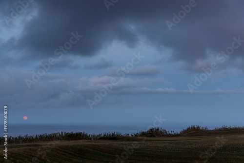 © Barosanu, Fototapeta premium A cloudy sky with a bright red moon in the background