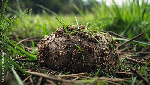 Fototapeta premium A clump of soil with grass growing on it, lying on the ground amidst green grass and plant stems.