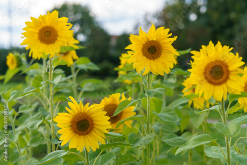 Fototapeta premium A cluster of blooming sunflowers surrounded by lush greenery. Bright colors...