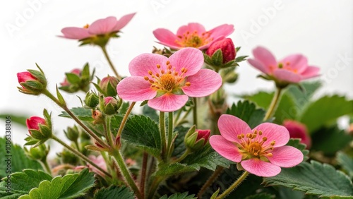 Fototapeta premium A cluster of bright pink strawberry flowers on a bushy plant, botanical...