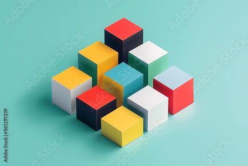 © Arif, Obraz premium A cluster of colorful, geometric cubes forms an abstract design. Various colors and sizes create a visually appealing composition on a teal background.