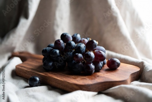© Anastasiia, Fototapeta premium A cluster of dark grapes rests on a wooden board, draped with fabric.