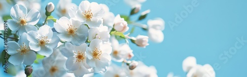 Obraz premium A cluster of delicate white blossoms with yellow centers bloom against a vibrant blue sky.