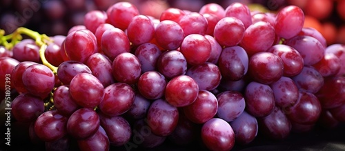 Fototapeta premium A cluster of delicious red globe grapes sits on top of a wooden table,...