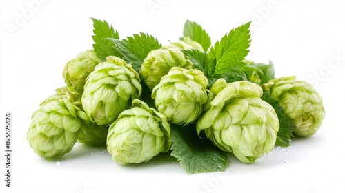 Fototapeta premium A cluster of fresh green hops cones, isolated on a clean white background with dewdrops shimmering on the surface
