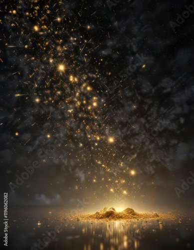 Fototapeta premium A cluster of glittering gold particles float in mid-air amidst a starry night...