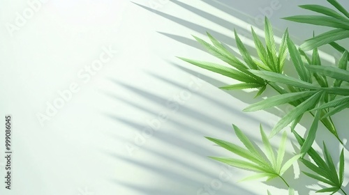 © mifta, Naklejka premium A cluster of green leaves with long shadows on a white background. Generative ai
