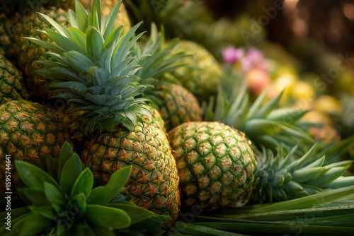 © Niken, Fototapeta premium A cluster of pineapples with their green tops clustered together amid scattered foliage
