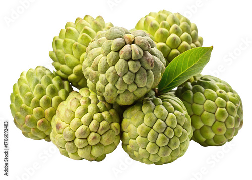 © Md, Fototapeta premium A cluster of ripe green custard apples with a single leaf isolated on transparent background