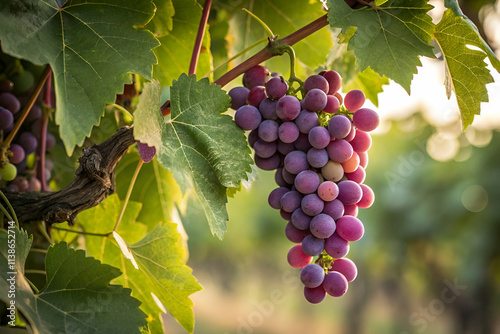 © Butsarakham, Fototapeta premium A cluster of ripe purple grapes hanging from a vine, surrounded by lush green leaves, capturing the essence of a vineyard at sunset.