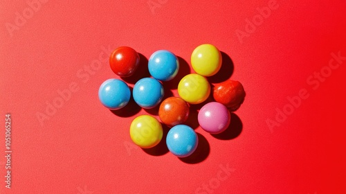 Obraz premium A cluster of round Smarties resting on a solid red background, the vibrant...
