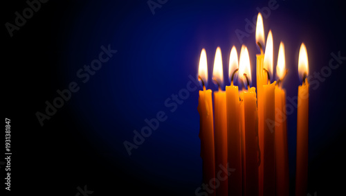 Fototapeta premium A cluster of tall yellow candles burning brightly against a dark blue...
