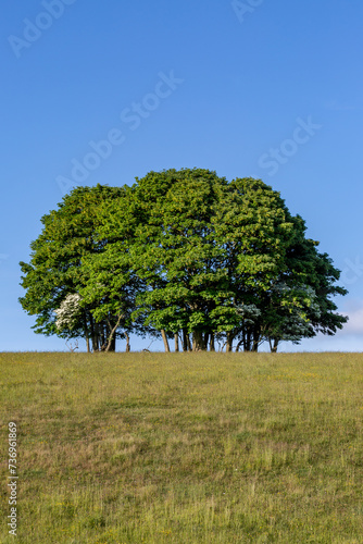 © lemanieh, Obraz premium A cluster of trees on a Sussex hillside, with a blue sky behind