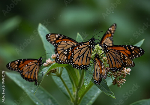 Naklejka premium A cluster of vibrant monarch butterflies resting on a green flowering plant,...