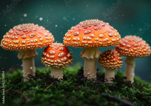 © RabeyaGraphix, Obraz premium A cluster of vibrant red and white spotted fly agaric mushrooms growing in a lush, green forest setting with a soft bokeh background