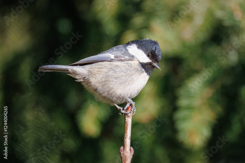 © Mariia, Naklejka premium A coal tit sits on top of the branch perpendicular to the camera lens on a sunny winter day.