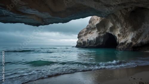 Naklejka premium A coastal cave where the water meets the shore at Praia da Coelha in...