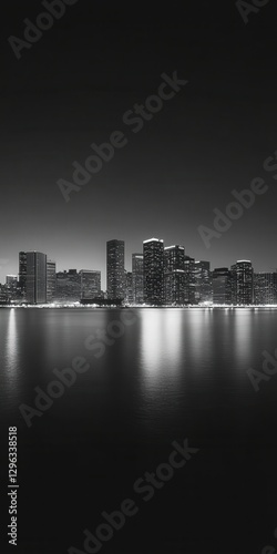 © nontawat, Fototapeta premium a coastal city at twilight. The skyline, lights glowing softly, is reflected in the water