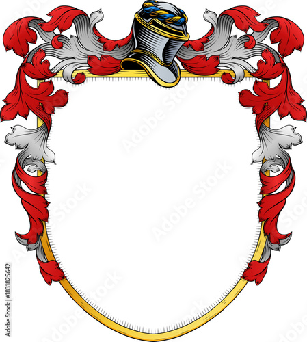 © Christos Georghiou, Naklejka premium A coat of arms or crest family heraldry medieval heraldic knight shield with helmet and acanthus filigree scroll ornament in a vintage woodcut style.