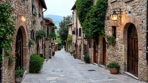 © Sonya, Obraz premium A cobblestone path bordered by stone structures and vibrant potted plants