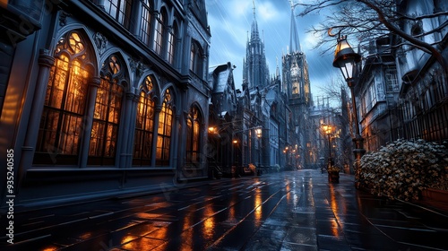 Fototapeta premium A cobblestone street lined with gothic buildings, lit by lampposts, after a...