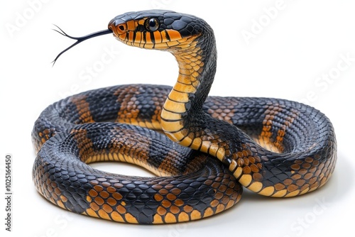 Fototapeta premium A cobra with its hood flared, standing in a defensive posture, isolated on white background
