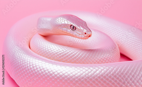 Fototapeta premium A coiled iridescent pink snake with smooth, shiny scales, resting against a...