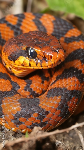 Fototapeta premium A coiled snake exhibiting bright orange and black scale patterns