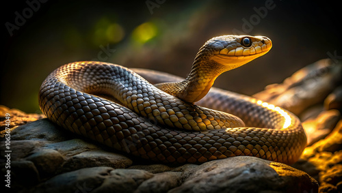 Fototapeta premium A coiled snake rests on a rock, illuminated by soft light, showcasing its...