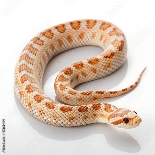© jamal, Obraz premium A coiled snake with light tan scales and brown spots on a white background in a studio setting