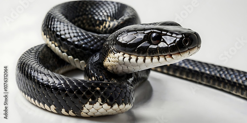 © Riefdeigartz, Obraz premium a coiled snake with various unique patterns and types, lying on a white background. Realistic view. created with generative AI