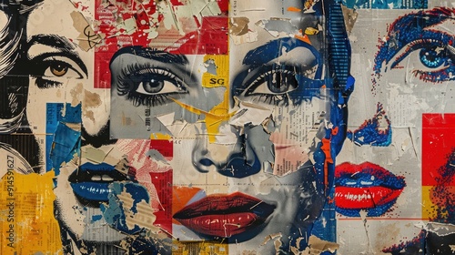© NDmCX-Nic, Obraz premium A collage of female faces with bold makeup and vibrant colors, creating a sense of mystery and intrigue.