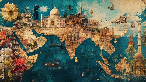 Fototapeta premium A collage-style map of India, integrating elements of nature and culture, with bright colors and textures,