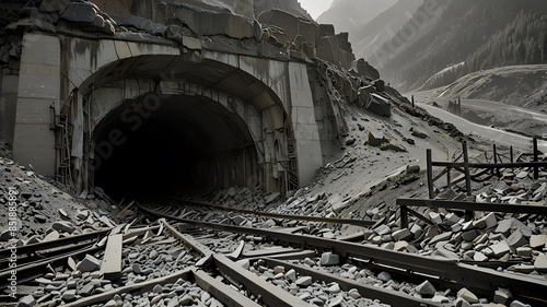 Naklejka premium A collapsed tunnel in a mountain, with rubble blocking the entrance and...