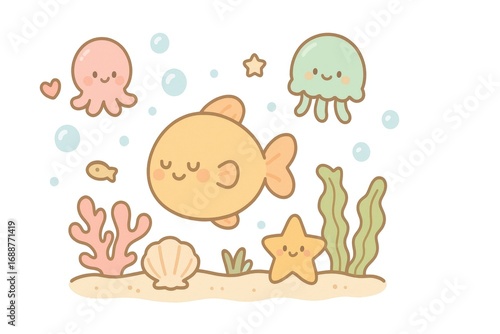 Fototapeta premium A collection of adorable sea creatures in a whimsical underwater scene, creating a joyful and imaginative illustration