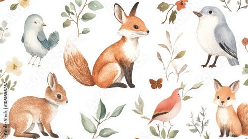 © Sirichat. Camphol, Naklejka premium A collection of animal watercolor graphics with soft, hand-painted illustrations of animals like rabbits, foxes, and birds, perfect for greeting cards and art prints