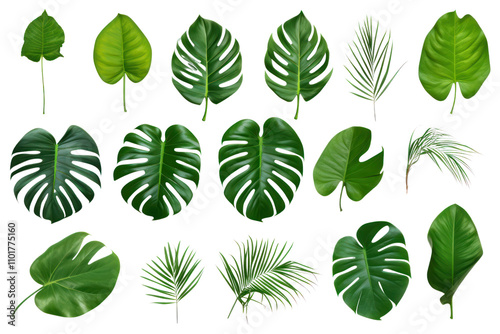 Fototapeta premium A collection of assorted green tropical leaves, including monstera and palm, isolated on white background