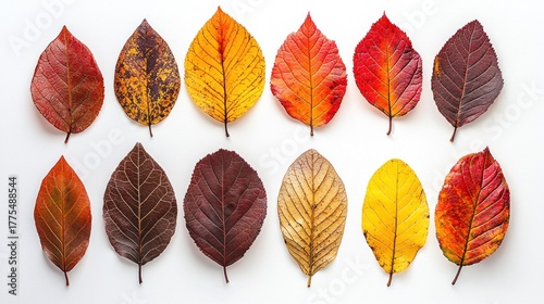 © K99Design, Fototapeta premium A collection of autumn leaves arranged in a grid on a white background.