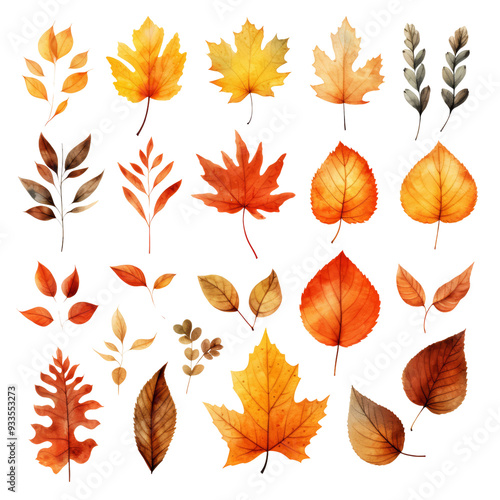 Fototapeta premium A collection of 20 autumn leaves in various shapes and colors, painted in a watercolor style.