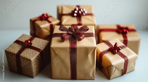 © Farah, Obraz premium A collection of beautifully wrapped gift boxes with red bows, set against a soft background