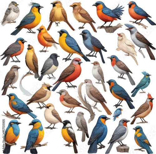 © AMINAH, Naklejka premium A collection of birds including one with a blue and green on the bottom