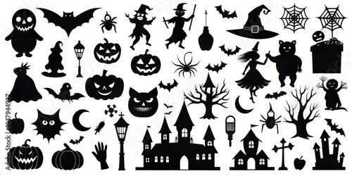 Fototapeta premium A Collection of Black Halloween Silhouettes Ghouls, Goblins, Witches, Pumpkins, Bats, Spiders, Castles, and More