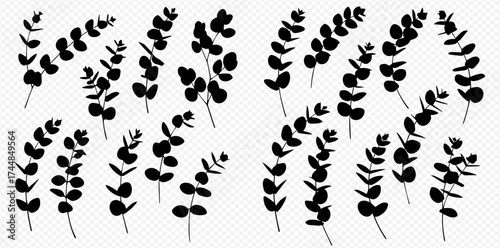 Naklejka premium A collection of black silhouette eucalyptus branches and leaves, isolated on a transparent background for design elements.